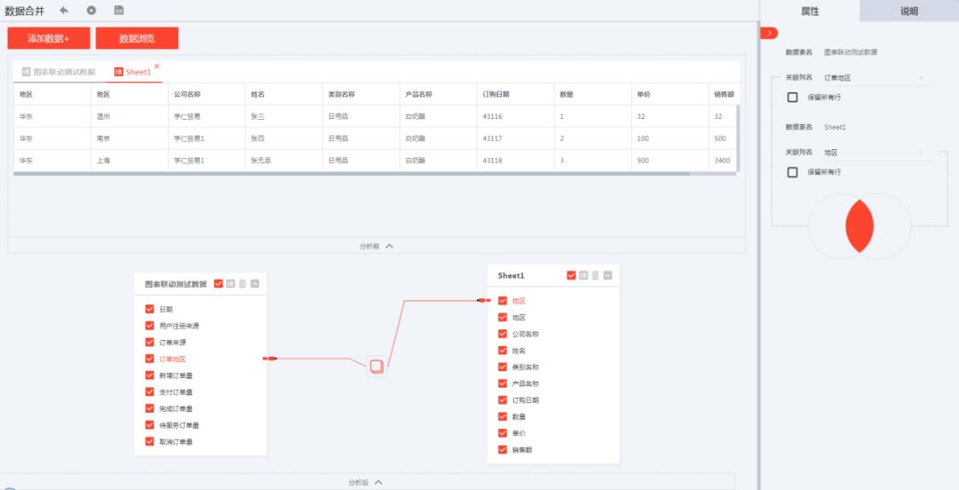 通过拖拽和简单的选择设置操作,即可快速完成数据建模。多个表数据表的关联操作,只需要在有关联关系的两个字段之间拖动连线完成关联,然后勾选关联后需要的数据字段,选择关联后数据集范围,一个建模过程即操作完成。建模过程中的数据结果及数据结构可实时查看,方便用户操作并掌控数据。W-Analytics将图表与用户的数据进行对接,建模后的数据表均通过数据源统一管理,并可管理数据字段类型,方便图表对接应用。