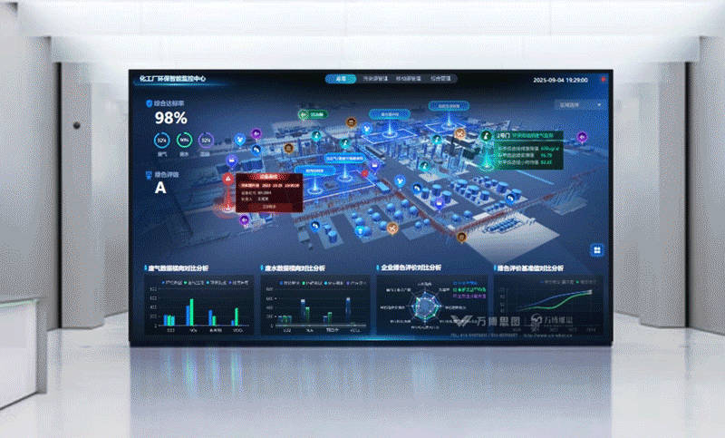 在绿色发展成为全球共识的今天,传统化工厂正面临严峻挑战:环保数据孤岛林立、预警响应滞后、移动污染源管控盲区多、环保投入产出难以量化。这些问题不仅让环保管理陷入救火队式的被动局面,更成为企业绿色转型的瓶颈。万博维思现代化工厂环保智能监控中心应运而生,集成了实时感知、深度分析、动态预警与战略决策于一体,通过四大功能屏,构建从宏观到微观,从实时到长效的完整管控闭环,真正实现了对环境风险的可知、可视、可管、可控。