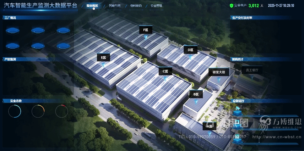 1.整体概览 如今的新能源汽车工厂体系庞大、节奏紧凑,任何一个失误都可能导致整线停滞。平台基于工厂建筑信息和生产布局构建三维可视化模型,实现厂区全景式交互浏览,集中呈现产能趋势、安全事故、交付及时率、能耗统计及设备异常等核心指标,使潜在风险在萌芽阶段即可被识别,确保生产计划不再依赖“事后反应式管理”。
