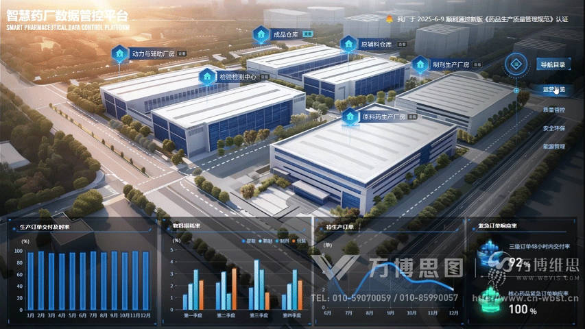 秉承全景一体化的理念,万博维思依托平台W-Max可视化能力和W-Twinsight数字孪生场景构建能力,打造智慧药厂数据管控平台,集成制药生产订单、物料损耗、质量偏差、安全事件、能源消耗等关键业务数据,打造覆盖生产全流程、全方位的数据管控体系,为药厂运营决策、质量改进、成本优化提供强有力的平台技术支撑。